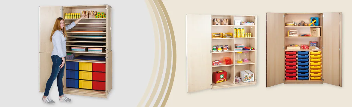 Szafki szkolne i półki do przechowywania są wszechstronne i można je ze sobą łączyć. Wiele wariantów modeli jest dostępnych w różnych dekorach, takich jak buk, klon i szary. Oznacza to, że meble można łatwo dopasować do istniejącego wyposażenia. Zapewnia to jednolity wygląd! W przypadku wysokiej szafki i półki z pojemnikami na długopisy, pędzle i mniejsze materiały można wybierać między różnymi kolorami szuflad: czerwonym, żółtym, zielonym, niebieskim i białym/przezroczystym. Są one również wyposażone w kilka regulowanych półek na segregatory i książki. Mobilne cokoły i wózki do suszenia pozwalają na elastyczne dostarczanie drobnych materiałów bezpośrednio na stanowisku pracy ucznia lub w innych salach lekcyjnych. Dzięki temu wszystko jest zawsze pod ręką i można je szybko schować!