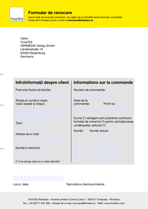 Pentru a vă exercita dreptul de retragere din acest contract, trebuie să ne informați pe noi (TimeTEX, HERMEDIA Verlag GmbH, Ländenstraße 10, 93339 Riedenburg, Deutschland / Germania, Tel.: +49 (0)9442 92209-0, Fax: +49 (0)9442 92209-66, E-mail: info[at]timetex.de printr-o declarație clară (de exemplu, o scrisoare trimisă prin poștă sau e-mail) cu privire la decizia dumneavoastră de a vă retrage din acest contract.