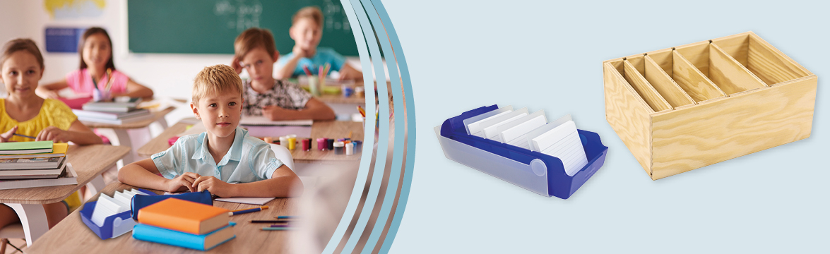 Särskilt i grundskolan, där det är viktigt att göra lärandet roligt för barnen, är nyttiga läromedel och läromedel som flashcard-boxen ett måste. Metoden är särskilt övertygande eftersom du lär dig två gånger genom att skriva flashcards själv och lära dig med flashcard-boxen. Men också för att korten kan skräddarsys. Här spelar signalfärger som rött, blått, grönt eller gult en viktig roll. Innehåll eller enskilda termer memoreras bättre om de har markerats med en överstrykningspenna i förväg.